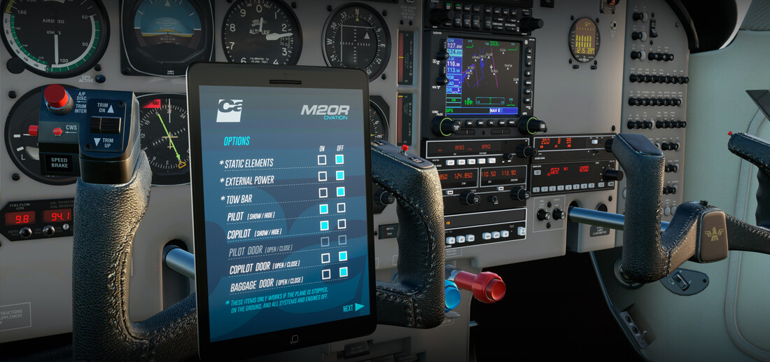 • Tablet interface for controlling static elements, pilots, opening doors, etc., and starting options such as cold and dark and ready to taxi